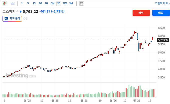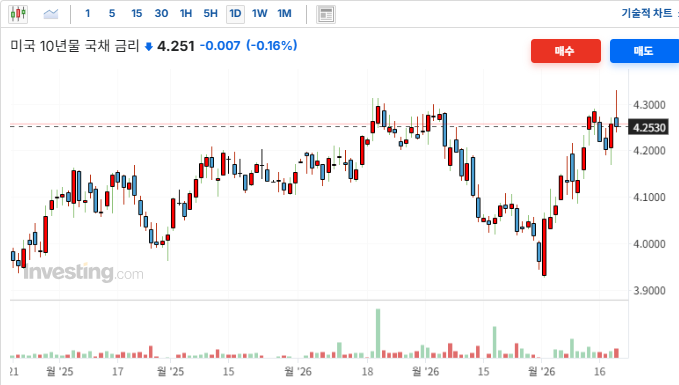 뉴욕 증시 마감 시점 4.25%대까지 하향 안정화되었던 미 10년물 국채 금리가 한국시간 20일 오전 10시를 기점으로 다시 4.27%를 돌파하며 상승 반전. 이는 전일 발표된 미국의 주간실업수당청수건수 지표가 아시아 시장 참여자들에게 '금리 인하 지연' 신호로 재해석된 결과로 분석됨. 금리상승세가 재개되자 장 초반 강세를 보였던 반도체 및 기술주 중심으로 차익 실현 매물이 출회됨. 나스닥 선물 지수의 하락 전환을 유도하며 코스피의 장중 상승 탄력을 둔화시키는 직접적인 원인이 됨. 10:30 이후 코스피 상승 폭이 축소되고 시가총액 상위 반도체주들이 고점 대비 밀린 배경