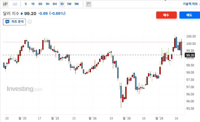 유가폭등세가 진정되고 지정학적 리스크가 '전면전'에서 '국지적 긴장' 수준으로 관리될 수 있다는 낙관론이 확산되면서 안전자산인 달러에 대한 수요가 감소함. 전일 FOMC 이후 급등했던 것에 대한 되돌림 매물과 함께, 타국 통화들의 상대적 강세가 나타나며 약세를 기록함. 달러약세는 미국 다국적 기업들의 해외 수익 가치를 높이는 요인으로 작용하여 대형주 중심의 매수세를 유입시키는 원인이 됨.