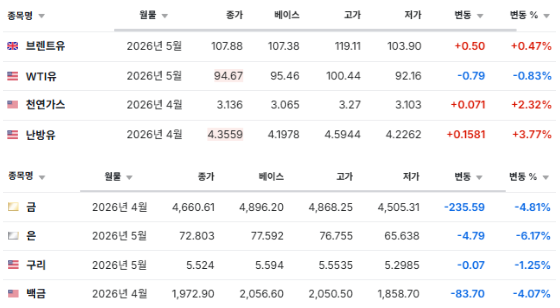 중동 위기로 인해 온스당 4,800달러를 돌파하며 고점을 찍었으나, 긴장 완화 뉴스 직후 수익 실현 매물이 쏟아지며 폭락함. 특히 유가 급등세가 꺾이며 '공포 지수'가 하락하자 안전자산에서 자금이 대거 빠져나와 증시 등 위험자산으로 이동하는 현상이 발생함. 금 가격의 급락은 시장이 최악의 시나리오를 탈피했음을 상징하는 신호로 해석되어 주식 시장으로의 유동성 환류를 촉진함.