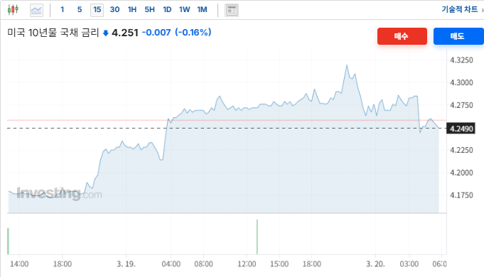 장 초반 중동발 에너지 쇼크와 견조한 고용 지표(실업수당 청구 건수 하회)로 인해 상승 압력을 받았으나, 트럼프 대통령과 네타냐후 총리의 긴장 완화 발언 이후 안전자산 선호 심리가 일부 후퇴하며 하락세로 반전함. 연준(Fed)의 매파적 동결 결정이 이미 가격에 선반영된 가운데, 전쟁의 극단적 확산 가능성이 낮아지며 금리가 안정세를 보임. 국채 금리의 하락은 밸류에이션 부담이 컸던 나스닥 등 기술주에 우호적인 환경을 제공하며 장중 지수 반등의 촉매제가 됨.