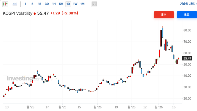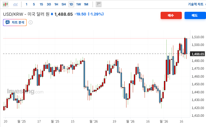장 초반 1,488원까지 떨어지며 안정세를 보이던 원/달러 환율이 아시아 장 중 달러 강세 기조가 부활하며 1,496.65원까지 8원 이상 급등. 달러인덱스가 99.4선으로 반등하자 외인 투자자들이 현물,선물시장에서 매도확대로 지수 하방압박. 외인 자금의 이탈우려를 키우며 장초반 지수를 반납하게 만든 수급악재.