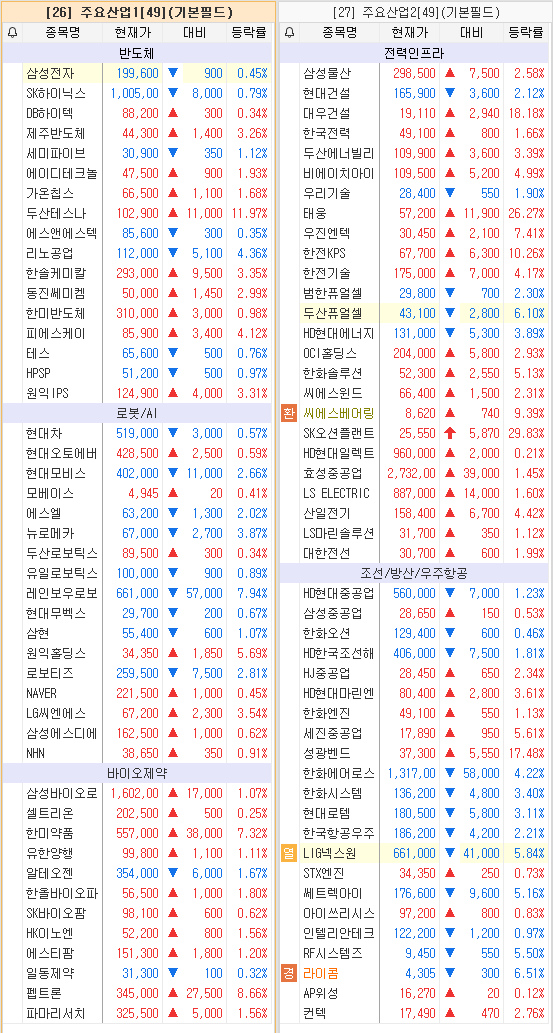 한전의 '에너지고속도로' 설계 착수 소식에 전력인프라주들이 상승. 체코 원전 세부계약 조율 소식에 원전건설과 기자재주 강세. 주말 BTS의 광화문 공연에 외국인 관광객이 쇄도소식에 백화점,레저,의류 등 경기소비재와 화장품업종이 특수 기대에 급등. 미 국채 금리 반등과 마이크론 하락관련하여 AI수익성 의구심 보도가 겹치며 삼성전자, SK하이닉스 등 대형주 중심으로 개장초반 상승폭 반납.