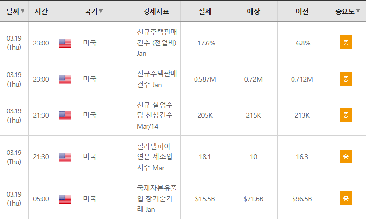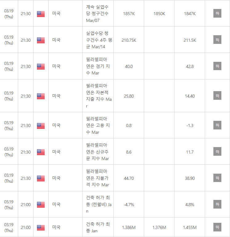 뉴욕시간 19일 오전 8시 30분, 주간 신규 실업수당 청구 건수가 예상치(21.5만 건)를 밑도는 20.5만 건으로 발표됨. 중동전쟁이라는 대외 악재 속에서도 미국 내부의 고용 시장이 여전히 견고하게 유지되고 있음을 데이터로 입증함. 다만 강력한 고용 지표가 연준의 금리 인하 시점을 늦출 수 있다는 매파적 해석이 동시에 제기됨. 미국 경제의 기초 체력에 대한 신뢰를 주었으나, 국채 금리 상승을 유발하여 기술주 상단을 제한함. 경기침체 우려를 불식시키는 원인이 되어 지수 하방 지지력을 강화하는 결과