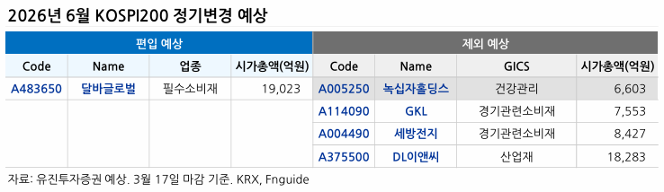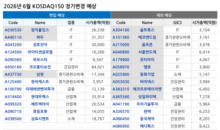 ㅇ KOSPI200, KOSDAQ150 정기변경 예상(2026년 6월) :