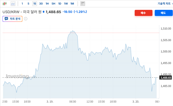 한국시간 19일 마감 시점(1500.06원) 대비 뉴욕 증시 마감 시점(1488.65원)에서 원화가 강세를 보였으며, 이는 한국 금융당국의 구두 개입과 안정화 대책 발표가 주효함. 범정부 차원의 100조 원 규모 안정화 프로그램 확대 소식과 달러 약세가 맞물리며 1,500원 선 아래로 내려옴. 원화 환율의 하향 안정화는 한국 ADR(삼성전자, SK하이닉스 등) 및 신흥국 시장 전반에 대한 투심 개선으로 이어져 뉴욕 증시 내 관련 섹터에 긍정적으로 작용함.