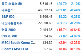 >매파적 연준 재해석: 전일 파월 의장의 "금리 인하 신중" 발언이 유럽 거래 시간대에도 유효하게 작용하며, 국채 금리 상승과 함께 기술주 중심의 매도세가 이어짐.