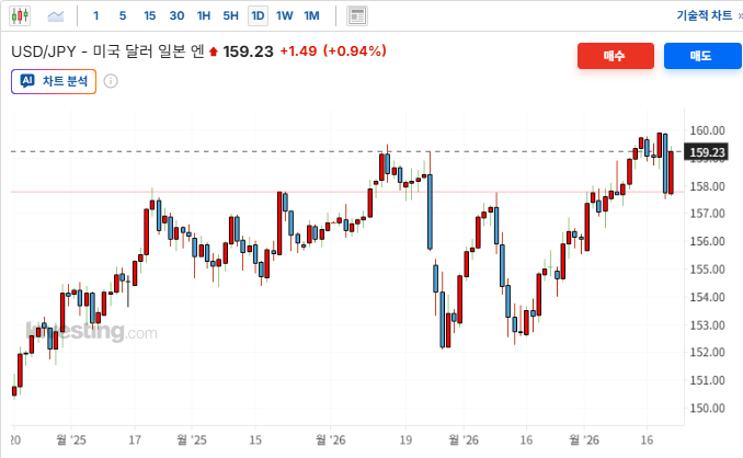 ㅇ 엔/달러 환율: 158.370 → 159.230 (+0.860, +0.54%)