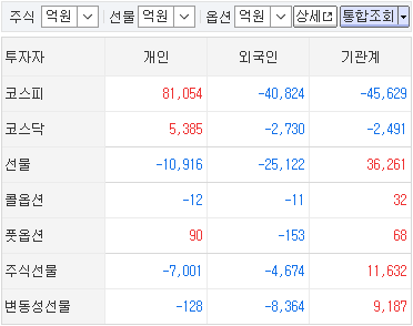 오늘 지수하락을 주도한 수급주체는 선물, 현물시장에서 지속적인 외인 매도세였음. 코스피와 코스닥 현물, 지수선물, 주식선물, 옵션을 총괄하여, 주가변동이 종료된 15:30경 수급 집계를 보면, 외인은 향후 증시하락을 기대하여 -7조3,208억 순매도. 기관은 외인의 거래상대방이 되며 떠안은 물량을 개인에게 전달하면서 -263억 순매도. 개인은 최종 주식 보유자로서 +6조8,420억 순매수.