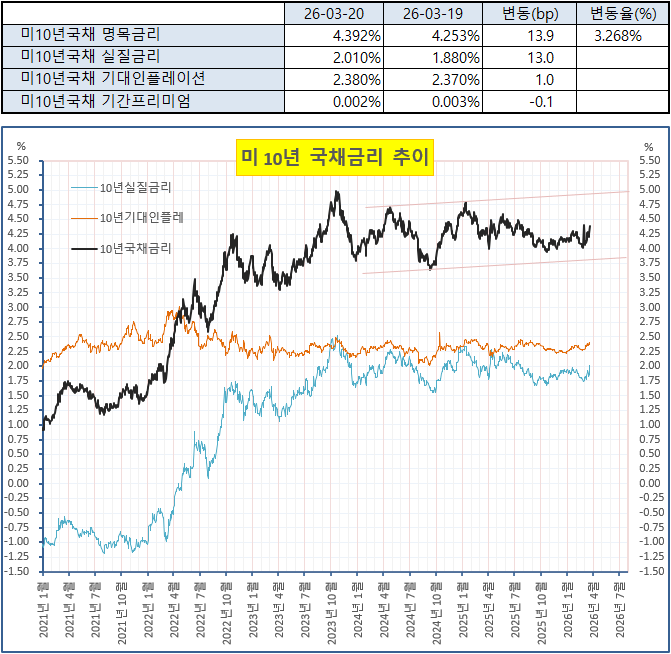 4. 미 국방부의 중동 추가 파병 및 군사 개입 확대 보도 : 뉴욕시간 20일 오후 3시경, 미국 정부가 호르무즈 해협 개방을 위해 추가 병력을 파견하고 군사 작전을 검토 중이라는 보도가 나옴. 백악관과 국방부가 중동 지역의 긴장 완화 대신 군사적 억지력 강화를 선택하며 전쟁 장기화 가능성을 시사함. 직접적인 군사 개입 우려에 안전자산인 국채로 자금이 쏠리며 주식 시장 내 위험자산 회피(Risk-off) 심리가 확대됨. 지정학적 불확실성이 단순한 국지전을 넘어 국제전으로 확산될 위험을 반영하며 증시 하락폭을 키움. 안전자산인 국채로 돈이 몰렸지만 국채금리도 폭등했는데 이는 유가급등으로 인한연준의 기준금리 인상가능성, 미국정부의 전쟁비용조달을 위한 국채발발행 증가우려가 반영되면서 국채금리마져 급등.