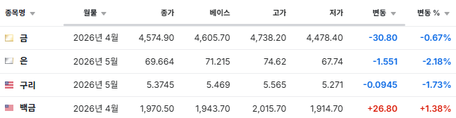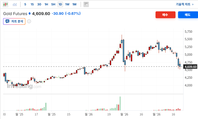 ① 유가급등과 예상치를 웃돈 PPI(생산자물가지수, +0.7%) 발표가 겹치며 시장의 금리전망이 뒤집힘. 금은 이자가 붙지 않는 자산이기에, 실질 금리가 상승하면 보유에 따른 기회비용이 커져 매도세가 강화됨. 현금확보를 위한 '리퀴데이션(강제 청산)' 및 마진콜