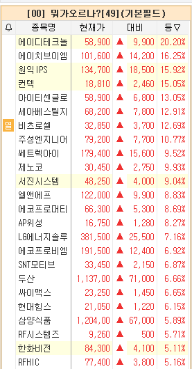 10. 제노코 (+9.93%) : 위성 통신 부품 및 항공 전자 장비 국산화 성공으로 국내 방산 기업향 매출 비중 급증함. 무인기 및 친환경 통신 사업 등 신성장 동력 확보 소식이 미래 가치 상승 기대감 자극함. 우주항공 섹터 전반의 온기와 기술적 최저점 탈피 흐름이 맞물리며 강력한 매수세 유입됨.
