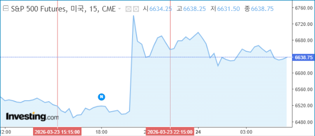 6,520선 하단에서 6,745.75(당일 고가) 부근까지 약 +3.4% 이상 수직 상승. 트럼프 대통령이 SNS를 통해 이란과의 '생산적인 대화'를 언급하며 향후 5일간 에너지 시설에 대한 공습 유예를 전격 발표함. 중동발 에너지 쇼크와 확전 공포가 극적으로 완화됨에 따라 유가가 10% 이상 폭락하고, 국채 금리가 하락하며 지수 선물이 강력한 '안도 랠리'를 보임.