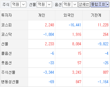 이날 지수하락을 주도한 수급주체는 선물, 현물시장에서 지속적인 외인 매도세였음. 코스피와 코스닥 현물, 지수선물, 주식선물, 옵션을 총괄하여, 주가변동이 종료된 15:30경 수급 집계를 보면, 외인은 향후 증시하락을 기대하여 -7조3,208억 순매도. 기관은 외인의 거래상대방이 되며 떠안은 물량을 개인에게 전달하면서 -263억 순매도. 개인은 최종 주식 보유자로서 +6조8,420억 순매수.
