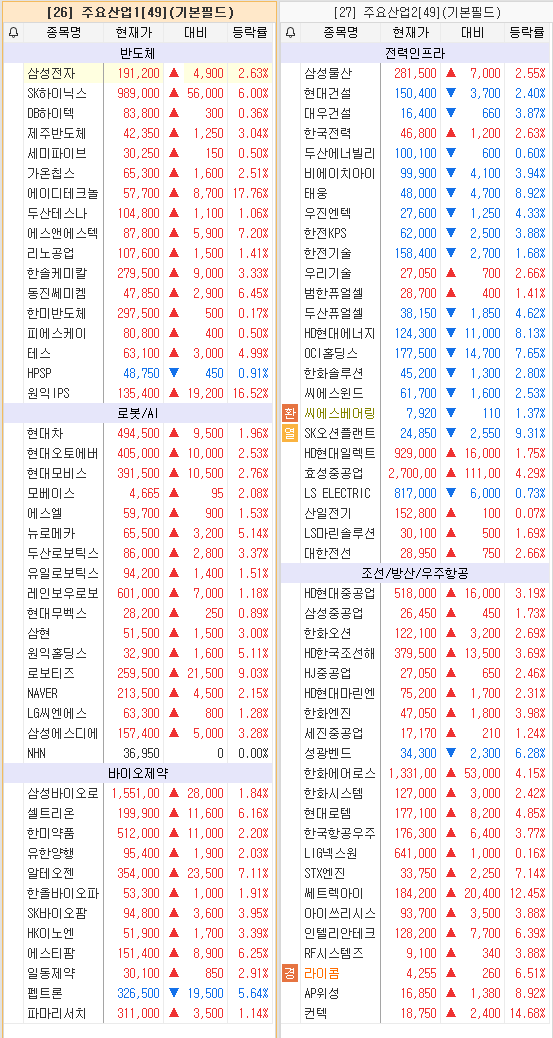 삼성물산 +2.55%, 현대건설 +2.40%, 대우건설 -3.87%, 한국전력 +2.63%, 두산에너빌리티 -0.60%, 비에이치아이 +3.94%, 태웅 +8.92%, 우진엔텍 +4.33%, 한전KPS +3.88%, 한전기술 +1.68%, 우리기술 +2.66%, 범한퓨얼셀 +1.41%, 두산퓨얼셀 -4.62%, HD현대에너지 +8.13%, OCI홀딩스 +7.65%, 한화솔루션 +2.80%, 씨에스윈드 +2.53%, 씨에스베어링 -1.37%, SK오션플랜트 -9.31%, HD현대일렉트릭 +1.75%, 효성중공업 +4.29%, LS ELECTRIC -0.73%, 산일전기 +0.07%, LS마린솔루션 +1.69%, 대한전선 +2.66%