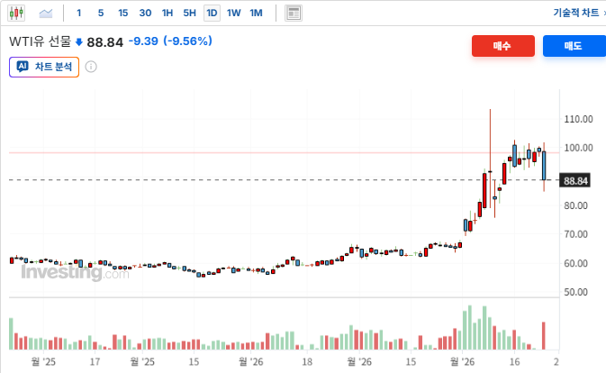 ㅇ WTI 유가는 트럼프 미국 대통령이 이란에 대한 공격을 보류하면서 공급 차질 우려가 완화되며 전일대비 배럴당 $10.10(-10.28%) 하락한 $88.13에 마감