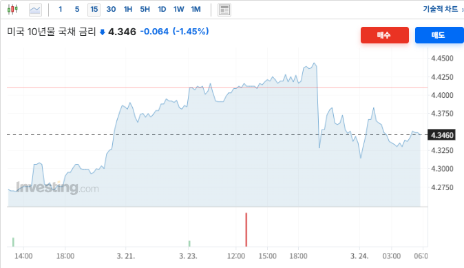 트럼프 대통령의 이란 공습 유예 및 협상 진전 발표로 전쟁 확전 공포가 진정되며 국채에 몰렸던 안전자산 수요가 일부 완화됨. 고금리로 압박받던 빅테크 및 성장주들의 밸류에이션 부담이 완화되며 나스닥을 중심으로 한 기술주 매수세 유입을 촉진함.