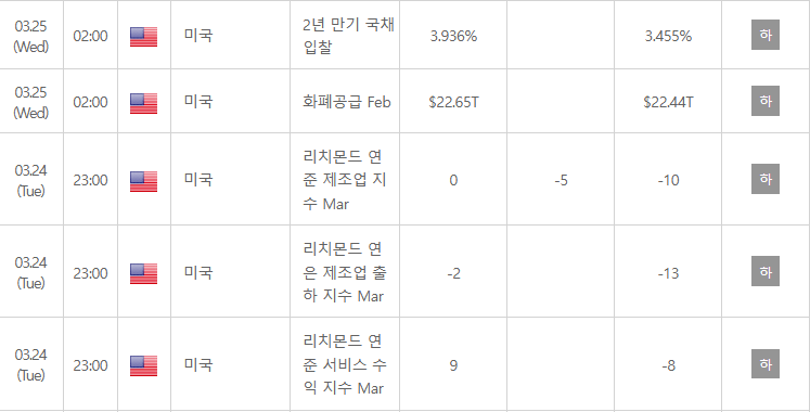 월스트리트저널(WSJ)이 24일 새벽 사우디와 UAE가 이란의 에너지 시설 공격에 대응해 미 연합군 합류를 검토 중이라고 보도함. 휴전 협상 소식 뒤에 숨은 확전 가능성이 다시 부각되며 장중 투자자들의 경계심을 자극하고 안전자산 수요를 유도함. 낙관론이 지배하던 시장에 긴장감을 재주입하며 유가의 하방을 지지하고 증시 변동성을 확대함.6. 미국 3월 S&P 글로벌 제조업 PMI 예상치 상회