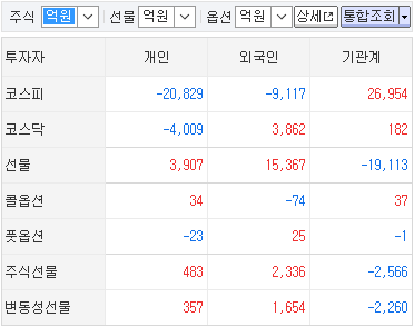 오늘 개장초반 코스피 지수 하락을 주도한 수급주체는 코스피 현물시장에서 외인 매도세였음. 중반이후 낙폭을 죽소한 수급주체는 지수선물에서 외인 매수세였음. 코스피와 코스닥 현물, 지수선물, 주식선물, 옵션을 총괄하여, 주가변동이 종료된 15:30경 수급집계를 보면, 외인은 향후 증시 하락을 기대하여 -3,240억 순매도. 기관은 외인의 거래상대방으로서 물량을 떠안았으나, 전일 증시폭락시 외인과 같이 매도하면서 지수폭락을 확대시킨다는 사회적 비판을 의식하여 오늘은 개인에게 전달하지않고 +2,579억 순매수. 개인은 소극적 최종 보유자로서 -720억 순매도.
