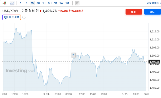 ㅇ 원/달러 환율: +0.12% 상승 (1494.930 -> 1496.760)]