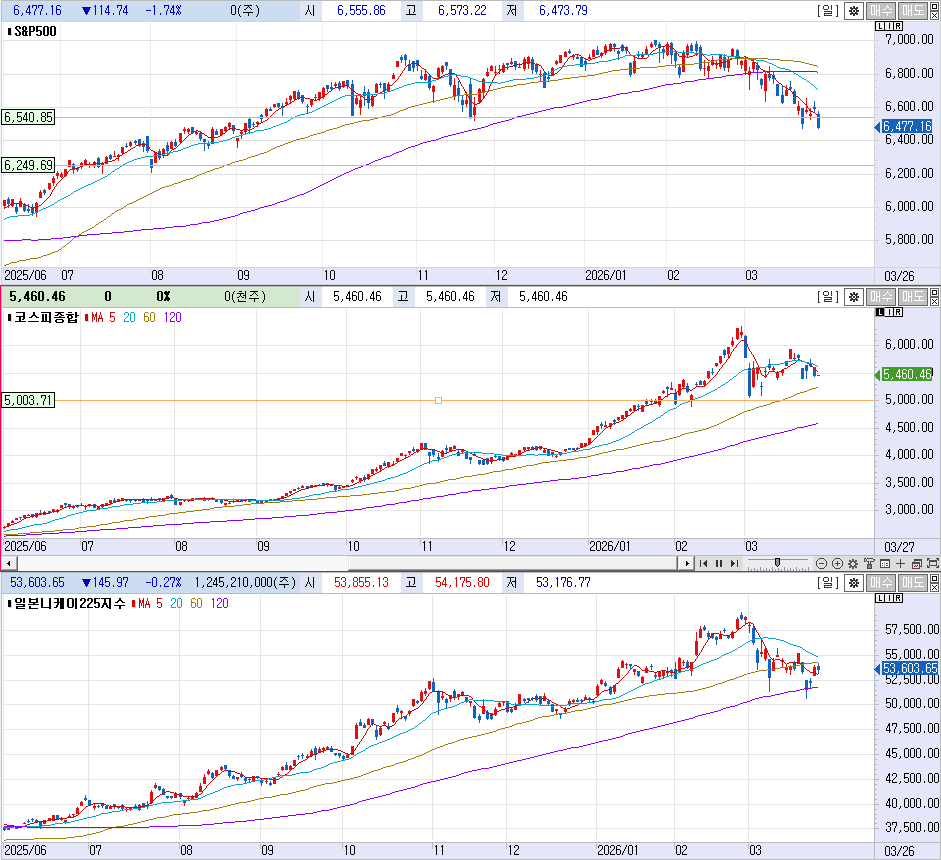 우상향, 5,364.97 도달, 트럼프 대통령이 이란 에너지시설 폭격을 '10일간 유예'했다는 소식이 재해석되며, 최악의 시나리오인 '즉각적인 전면전'은 피했다는 안도감이 매수 심리를 자극함. 장 초반 급락했던 SK하이닉스 등 대형 반도체주들이 실적 대비 과도한 하락이라는 분석 리포트와 함께 외국인의 매도세가 잦아들며 지수 상승을 견인함. 미국 S&P 500 선물 지수가 아시아 장에서 소폭 반등(+)에 성공하며 국내 증시의 투자 심리 개선에 긍정적인 영향을 미침.■ 3월 27 매크로 변수 변화 14:05