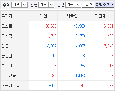 개장이후 코스피 지수 하락을 주도한 수급주체는 코스피 현물, 지수선물 외인매도세였음. 코스피와 코스닥 현물, 지수선물, 주식선물, 옵션을 총괄하여, 주가변동이 종료된 15:30경 수급집계를 보면, 외인은 향후 증시 하락을 기대하여 -3조9,699억 순매도. 거래상대방이 된 기관은 +5,246억 순매수, 개인은 최종 주식보유자로서 +3조1,578억 순매수.