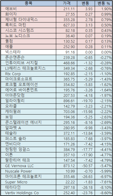 ㅇ 방산/우주항공/조선 : 제너럴 다이내믹스 +0.79% / 록히드 마틴 +0.50% / L3해리스 테크놀로지스 -0.76% / RTX Corp -1.10% / 보잉 -2.63% / 헌팅턴 잉걸스 -4.41%