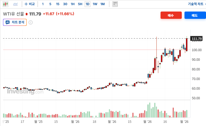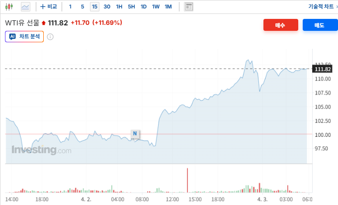 2. WTI 원유 선물, 지정학적 불안 지속에 배럴당 111달러 돌파하며 11% 폭등 : 유가가 100달러 선을 강하게 상향 돌파하며 인플레이션 압박을 가중시켰으나, 에너지 섹터의 강세와 시장의 내성이 교차함. 중동 지역의 군사적 긴장감이 해결되지 않았다는 분석 속에 WTI 가격이 전일 대비 11달러 이상 급등한 111.14달러로 마감함. 에너지 비용 상승에 따른 기업 이익 훼손 우려가 장 초반 지수를 압박했으나, 에너지 기업들의 주가 강세가 하락폭을 상쇄함. 인플레이션 장기화 전망에도 불구하고 경제 지표가 견조하게 나타나며 시장은 유가 충격을 흡수하는 모습을 보임.