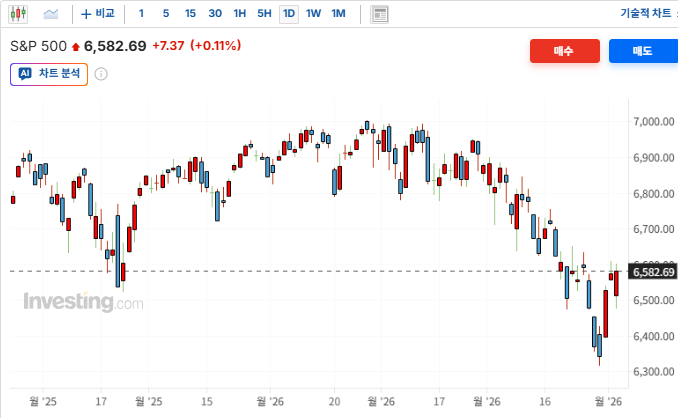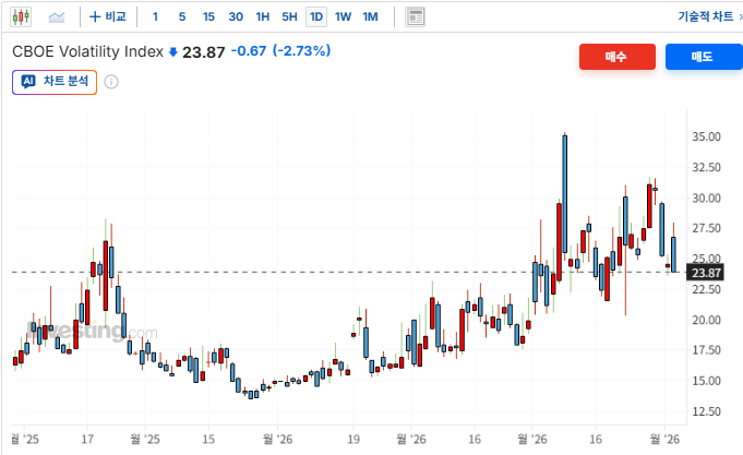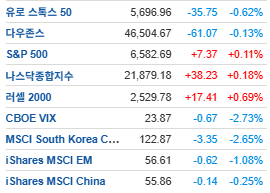 > 공포 지수 하락에 따른 위험자산 귀환 : 변동성 지수인 CBOE VIX가 -2.73% 하락한 23.87을 기록하며 장중 극도로 고조되었던 투자자들의 불안 심리가 빠르게 진정됨. 안전자산인 금(-2.42%)에서 빠져나온 자금이 주식 시장, 특히 중소형주 중심의 러셀 2000(+0.69%) 섹터로 유입되는 순환매 양상이 뚜렷함.