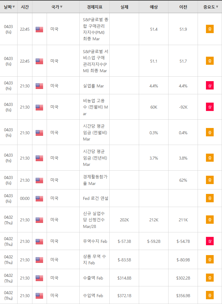 이번주 주요 경제지표 발표 등 증시변동성 확대를 수반할 이벤트는 현지시간 기준,△03일(금) 미국, 독일, 영국, 홍콩 부활절 휴장 미국 3월 비농업부분고용자수 변동, 민간 부문 고용자수 변동, 시간당 평균 임금, 실업률, ISM 서비스, 가격, 고용, 신규주문 , S&P글로벌 종합, 서비스업 PMI.가 예정되어 있음