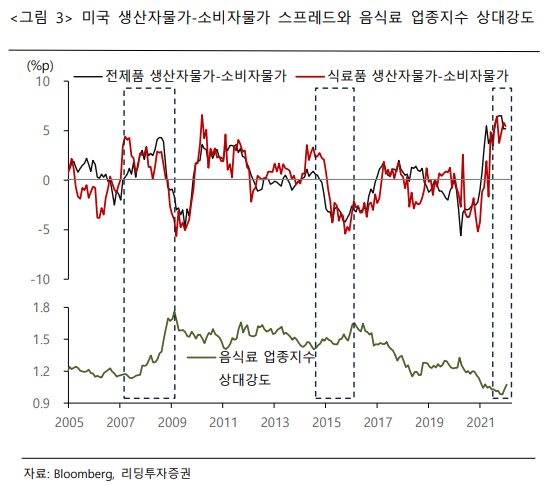 - 가장 주목하는 부분은 한국의 식료품 <생산자물가(yoy%)-소비자물가(yoy%) > 스프레드가 0선 부근에서 최근 등락 중인 점임. 전제품과는 달리 식료품은 2 차례의 이전 사례에서 스프레드가 0 선 부근 등락이 확인되면서 국내 음식료 업종지수의 상대적 강세국면이 본격화되었음.