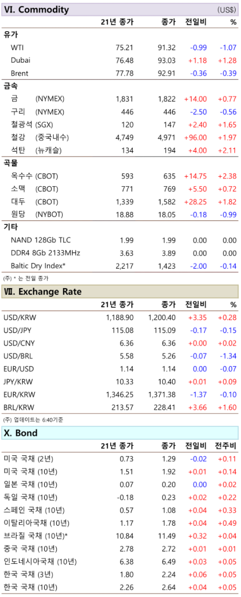 금은 미-중 무역 갈등 및 인플레이션 우려 속 상승, 구리 및 비철금속은 달러 강세 불구 경제 정상 화 기대 속 상승. 한편, 알루미늄은 우크라이나 문제로 상승폭이 컸음. 곡물은 미 농무부의 세계 곡 물 생산 보고서 발표를 앞두고 차익 매물이 출회되며 하락. 중국 상품선물시장 야간장에서 철광석 은 3.07% 하락, 철근은 0.10% 상승.