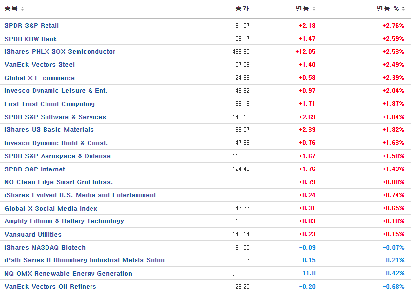 델타항공(+4.08%) 등 항공업종, 카니발(+4.79%) 등 크루즈 업종, 매리어트(+3.32%) 등 호텔업종은 경제 정상화 기대에 따른 서비스부문 매출증가 가능성이 높아지자 상승. 펠로톤(+25.28%)은 부진한 실적 발표에도 불구하고 CEO의 퇴임으로 인수 합병 가능성이 높아지자 급등.