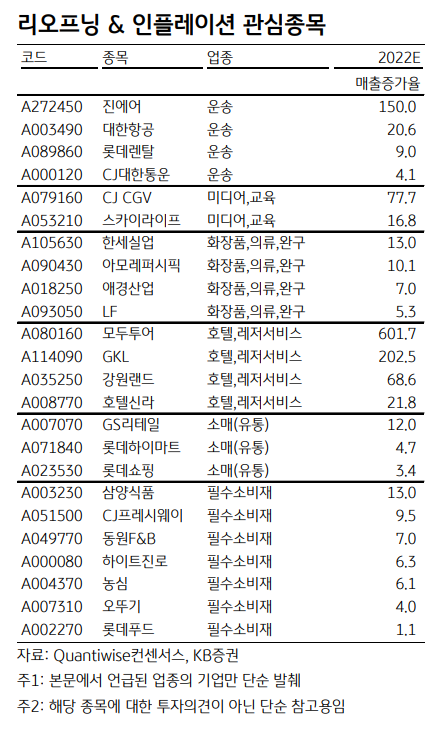 리오프닝 기대감이 인플레이션 속에서 피어날 가능성이 커졌다. 회복으로 가는 길에 인플레이션 의 파도를 유리하게 이용할 수 있는 업종/종목이 무엇일지 고민했다