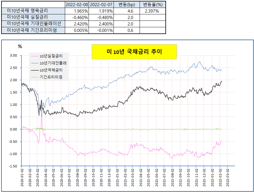 국채금리는 소비자물가지수 발표를 앞두고 높은 인플레이션에 대한 우려로 상승. 그러나 국제유가가 하락 한데다, 미 3년물 국채입찰에서 응찰률은 12개월 평균(2.44배)과 비슷한 2.45배를 기록 했으나 간접입찰이 12개월 평균(53.0%)을 크게 상회한 68.5%를 보이는 등 채권수요가 강하다는 소식이 전해지자 상승폭이 일부 축소. 실질금리, 기대인플레이션, 텀프리미엄 동반 상승.