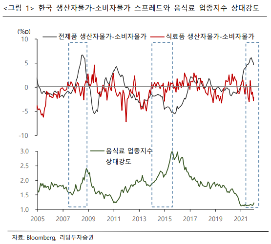 <생산자물가(yoy%)-소비자물가(yoy%)> 스프레드가 0 선 부근에서 등락 중이라는 것은 원재료인 곡물가격 상승 등으로 발생한 매출원가 부담을 제품가격 인상을 통해서 상당 부분 상쇄하고 있는 것으로 해석할 수 있음