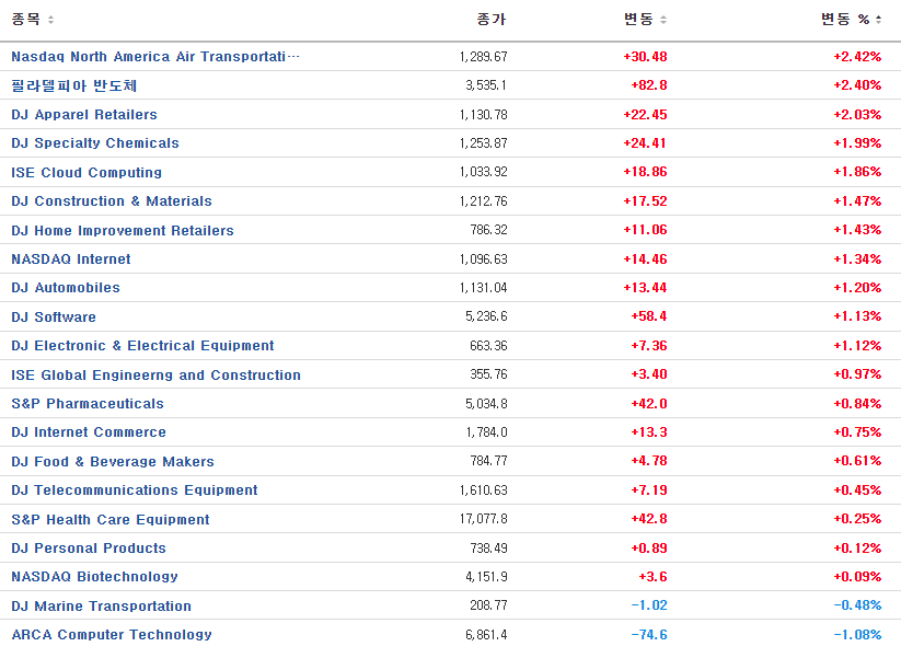 첫째, 반도체 업종은 듀폰(+6.32%) 실적발표에 힘입어 상승, 듀폰이 주목받은 이유는 반도체제조 및 패키징에 사용되는 특수재료를 제공하는 사업부문의 매출이 4분기 19%성장했다는 소식 때문. 최근 텍사스인스트루먼트(+1.58%), 퀄컴(+2.00 등의 컨퍼런스에서 듀폰이 등장 했었고, 관련부문의 뚜렷한 성장세를 확인하자 반도체 산업의 성장에 대한 기대심리가 부각되며 반도체업종의 상승을 이끌었음.(필라델피아 반도체 지수 +2.40%)
