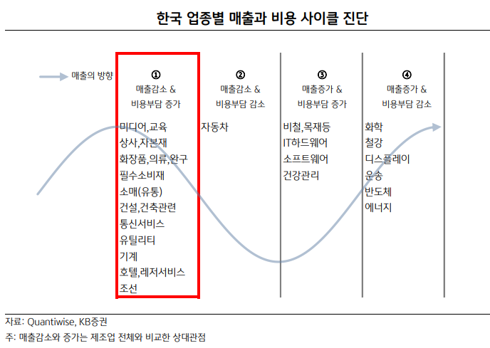 회복과 가격전가가 가능하기 때문이다. 매출이 늘어도 이익률을 유지했던 경험으로 가격전가능력을 파악해 ①+②의 업종을 줄 세우면 화장품,의류,완구, 필수소비재, 미디어,교육, 호텔,레저서비스가 유리하다. 통신, 기계, 자동차, 유통이 다음, 조선, 유틸리티, 건설은 하위권이다.