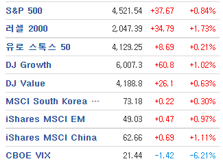 ㅇ 다우+1.06%, S&P+0.84%, 나스닥+1.28%, 러셀+1.63%)