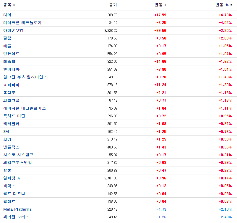 듀폰(+6.32%)은 견고한 실적 발표에도 불구하고 원자재 가격상승 등으로 가이던스를 하향 조정. 그러나 자사주 매입과 배당 증액 발표로 상승. 특히 듀폰의 반도체 제조관련 특수재료사업부문 매출성장이 확대되자 반도체 업황에 대한 기대심리가 높아지며 마이크론(+4.02%), 퀄컴(+2,00%), 텍사스인스트루먼트(+1.58%) 등 반도체주 강세.