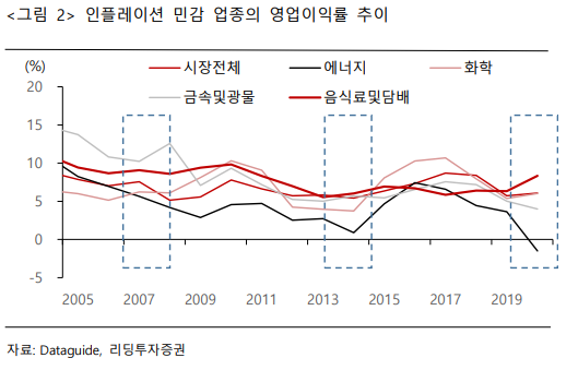 - 국내 인플레이션 민감 업종의 영업이익률 추이를 살펴본 결과 ‘음식료및담배’ 업종지수는 해당 국면에서 상대적으로 양호한 영업이익률 추이를 나타냈음.